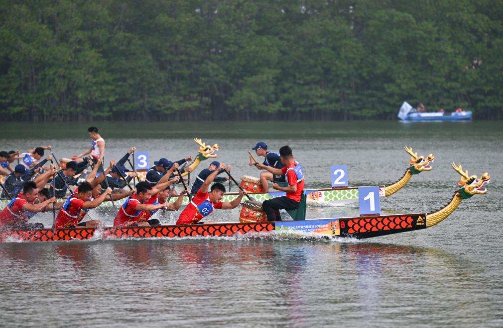 随着裁判一声令下,鼓手身姿矫健,鼓槌如流星般起落,“咚咚咚”的鼓声似战鼓催征,激昂的节奏让人心潮澎湃,而位于船尾的舵手确保龙舟“行稳致远”。