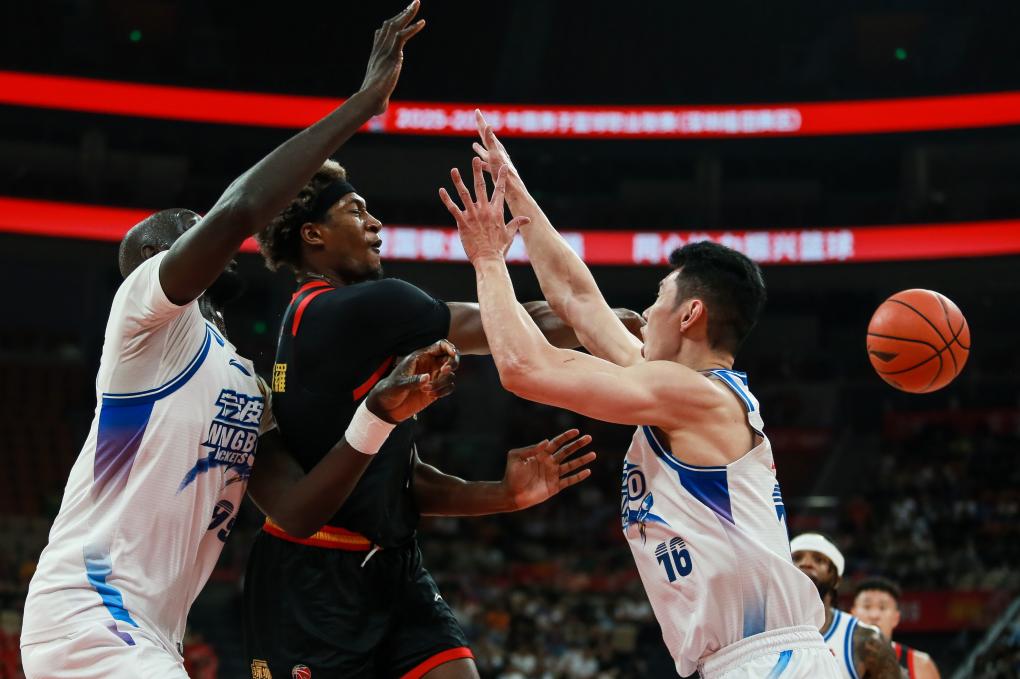 4月17日,深圳队球员卡巴(中)在比赛中传球。新华社发(彭志刚摄)