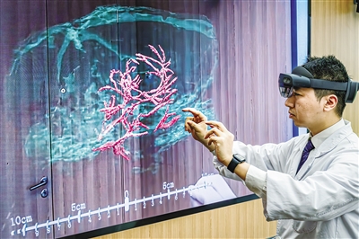 图为科研人员展示通过混合现实技术,微米级呈现脑机接口装置与大鼠大脑主要血管和脑组织的空间位置关系。新华社记者 肖艺九 摄
