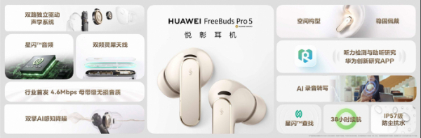 华为FreeBuds Pro 5悦彰耳机采用全新悦彰星环设计,提供四款配色,它是业界首款支持星闪™音频技术的无线耳机,其搭载华为自研第三代音频芯片,配合L2HC 5.0协议,最高传输速率可达4.6Mbps,可聆听96kHz/24bit母带级无损音源。耳机同时是首款双擎AI感知降噪耳机,采用双单元双路主动降噪架构,降噪效果最高提升至220%。华为FreeBuds Pro 5用户在“华为创新研究APP”加入听力检测与助听研究后,耳机可居家进行听力检测并为中轻度听损用户提供听力补偿。同时,FreeBuds Pro 5新增AI录音转写功能,支持实时转写并生成摘要、待办事项。华为FreeBuds Pro 5将于2025年11月25日正式发售,售价1499元。