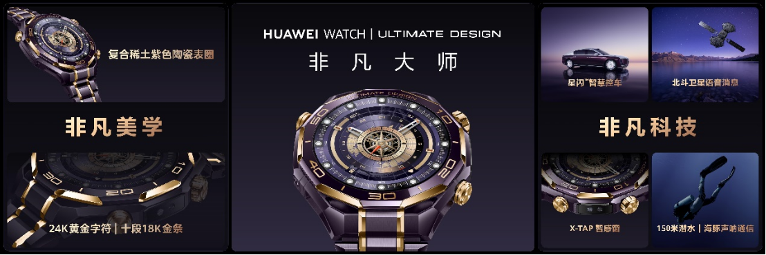 本次发布会还带来了新一代HUAWEI WATCH ULTIMATE DESIGN非凡大师紫金款,它将智能手表的尖端科技与传统经典腕表美学设计融为一体。新品机身不仅以手工镶嵌10段18K黄金,还有复合稀土紫色陶瓷表圈,紫金相彰诠释高贵非凡格调。其强悍内核更是集成eSIM先锋通信、北斗卫星语音消息、150米深潜能力与海豚声呐通信技术等尖端技术,以及X-TAP智感窗健康监测、星闪™连接智慧控车等丰富功能。