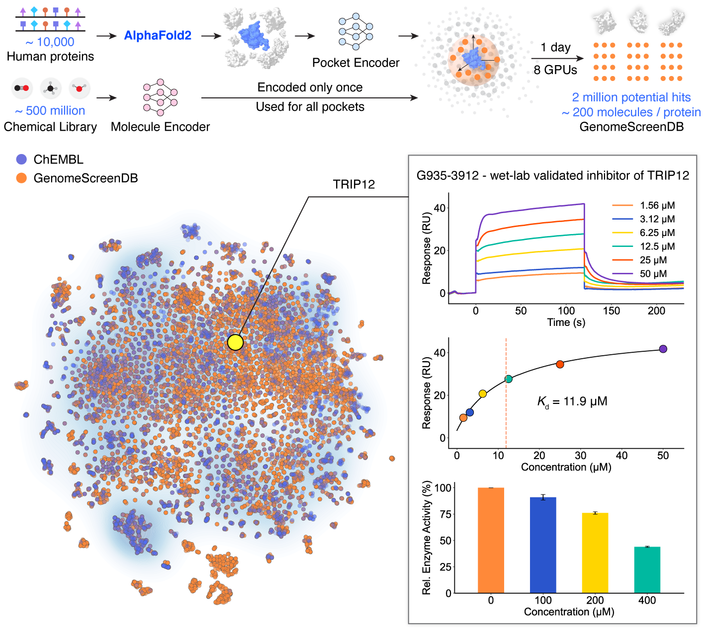 值得关注的是,DrugCLIP支持对AlphaFold预测的蛋白结构和apo(无配体)状态下的蛋白口袋进行筛选,扩大了其在真实药物发现场景中的适用性。团队和清华大学刘磊教授团队合作,针对E3泛素连接酶TRIP12(thyroid hormone receptor interactor 12)进行了虚拟筛选与实验验证。过往研究发现,TRIP12是多种肿瘤、帕金森综合征的潜在靶点,但是TRIP12缺少已知的小分子配体和复合物结构。团队使用DrugCLIP模型,从160万个候选分子中高通量筛选出约50个高评分分子,SPR实验证实,其中10个分子与TRIP12有结合能力,两个亲和力较高的分子也对TRIP12的泛素连接酶活性有一定的抑制活性。
