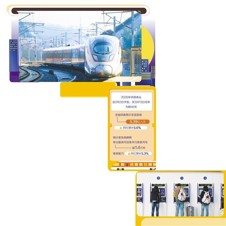 2026年铁路春运自2月2日开始,至3月13日结束,为期40天,全国铁路预计发送旅客5.39亿人次、同比增长5.0%,节前客流高峰日预计为2月13日(农历腊月廿六),节后客流高峰日预计为2月23日(农历正月初七)。