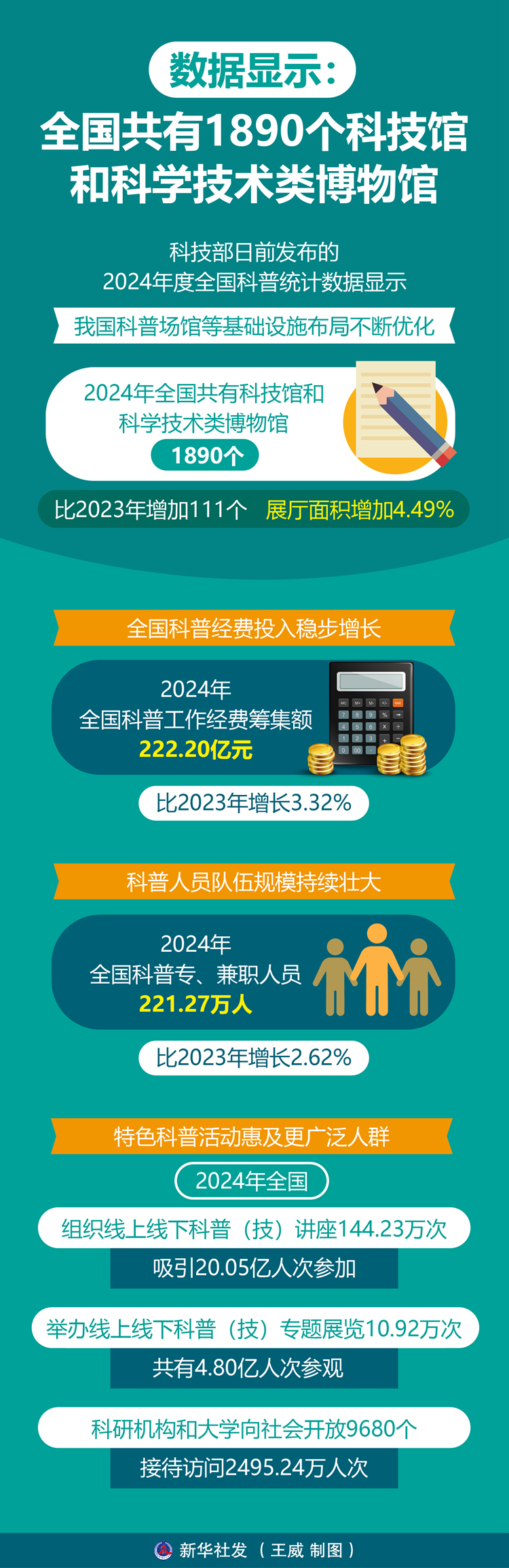 新华社北京1月29日电(记者 温竞华)科技部日前发布的2024年度全国科普统计数据显示,我国科普场馆等基础设施布局不断优化,2024年全国共有科技馆和科学技术类博物馆1890个,比2023年增加111个,展厅面积增加4.49%。