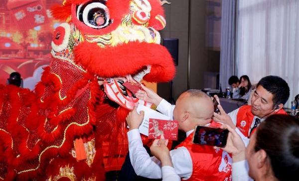 图为:深圳家宴现场,舞狮送祝福