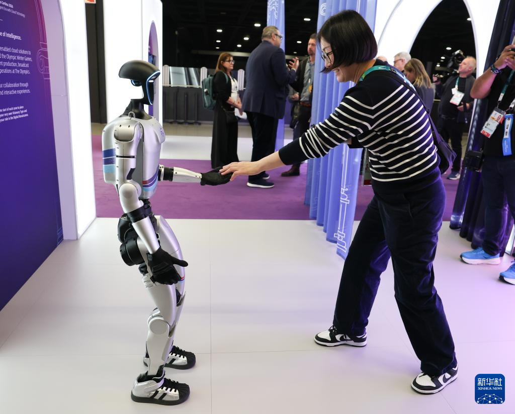 2月4日,参观者在阿里巴巴云产品展览区与机器人导览互动。