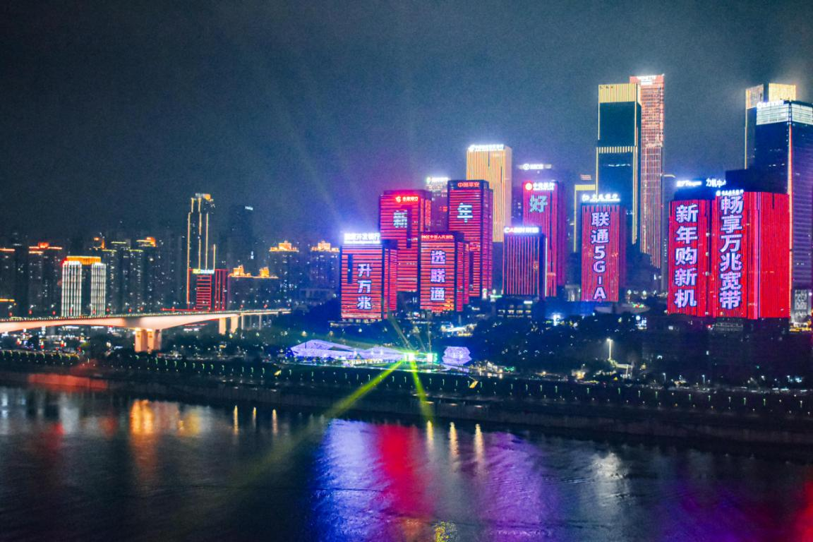 重庆联通以科技光影为笔,在两江四岸打造新春灯光秀,将联通好网络、好服务的品牌目标与新春祝福深度融合,让科技年味满溢山城。