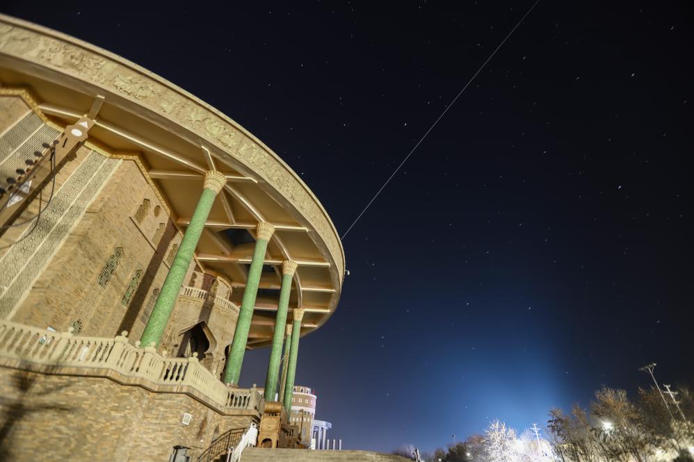 2022年12月28日,在新疆哈密拍摄的中国空间站飞过哈密木卡姆传承中心。新华社发 (王俊峰 摄)