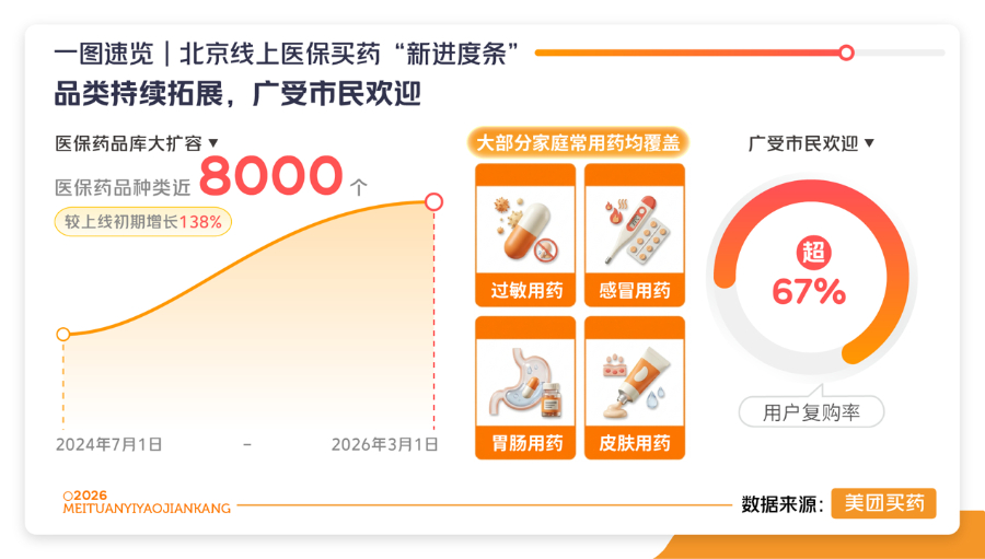 不仅要买得到,还要买得全。在扩大药店覆盖面的同时,线上支持医保支付的药品种类也在持续扩容。目前,北京线上医保药品种类已近8000个,较上线初期增长138%。从春季高发的过敏用药,到日常必备的感冒、胃肠、皮肤用药,均已实现全面覆盖,极大满足了市民多元化、个性化的健康需求。