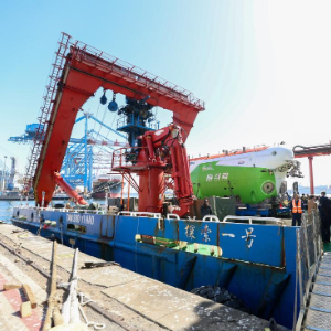 这是3月5日在停靠于智利瓦尔帕莱索的中国“探索一号”科考船上拍摄的“奋斗者”号载人潜水器。新华社发(豪尔赫·比列加斯摄)