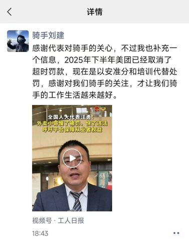 “感谢代表对骑手的关心,不过我补充一个信息,2025年美团已取消超时罚款,现在是以‘安准分’和培训代替处罚。”跑单近9年的老骑手刘建通过社交平台回应道,“感谢对我们骑手的关注,才让我们骑手的工作生活越来越好”。
