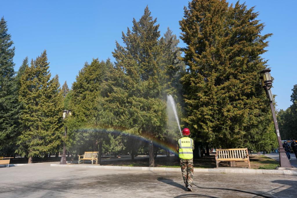 3月15日,在北京地坛公园,工作人员使用添加了花粉控制剂的水对柏树进行喷淋。新华社记者 鞠焕宗 摄