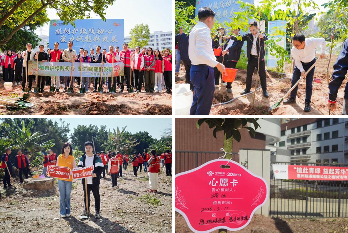在东莞,活动联合东莞市委金融办、东莞证券、华联期货等多家单位开展植树护绿行动,携手共建“暖暖公益联盟”,现场客户与志愿者在春日里种下成片新绿,共同为新苗挂上认养铭牌,让绿色公益与暖心服务双向奔赴。在惠州,广东联通与客户、志愿者百余人共植“联通公益林”,树苗上系满“心愿卡”,写下对美好环境的期许与祝福。