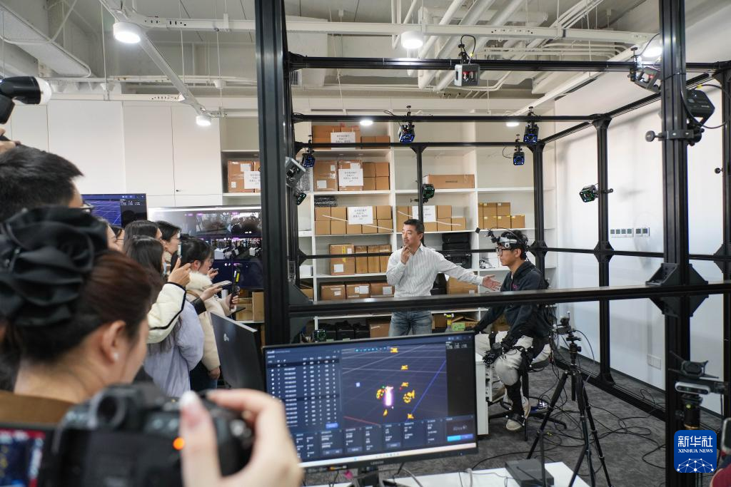 3月18日,在北京中关村(海淀)具身智能创新产业园,诺亦腾机器人副总裁、合伙人李遥(后排右二)在介绍高精度人类行为数据与机器人数据的采集、标注、预处理。