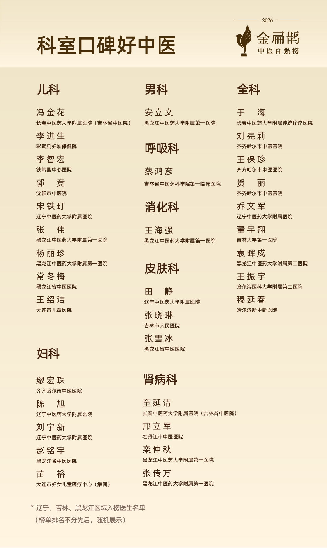 3月26日,2026金扁鹊中医百强榜在北京主会场正式发布。东北地区共有38位医生入榜,覆盖辽宁、吉林、黑龙江3个省级行政区、9个城市,与上届基本持平。其中,黑龙江20位、辽宁11位、吉林7位,构成区域内稳定的供给结构。