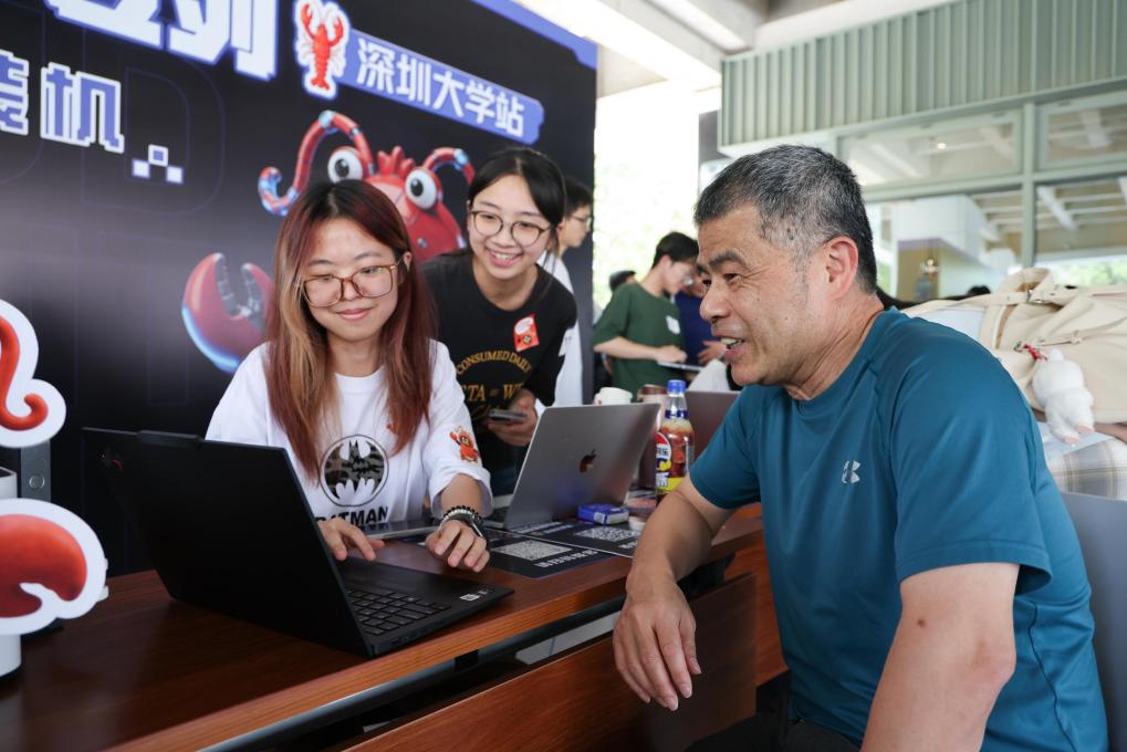 3月19日,在“腾讯AI百校行高校龙虾专列”深圳大学活动现场,深圳大学高等研究院特聘教授、博士生导师黄少鹏(右)了解“龙虾”和腾讯的相关智能体产品。黄少鹏说,科研工作中有些内容可能涉密,还有一些科研成果还未发表,担心使用AI工具存在泄密风险。
