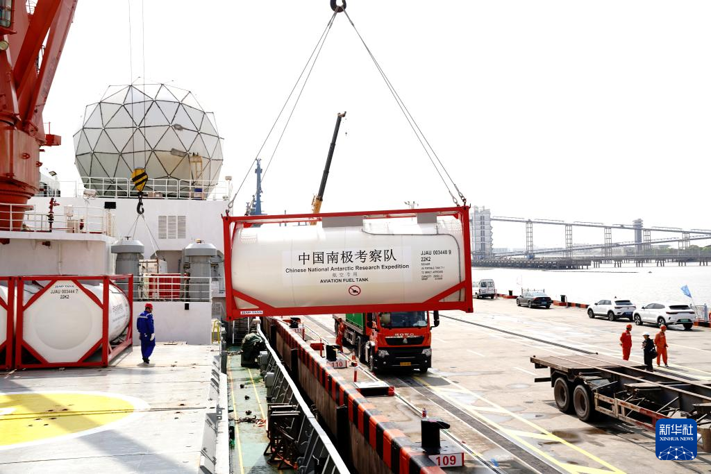 4月9日,工作人员操作机械从“雪龙”号上卸货。