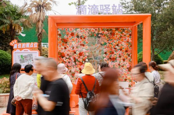 图为:“牡丹花版”滴滴驿站吸引游客打卡拍照