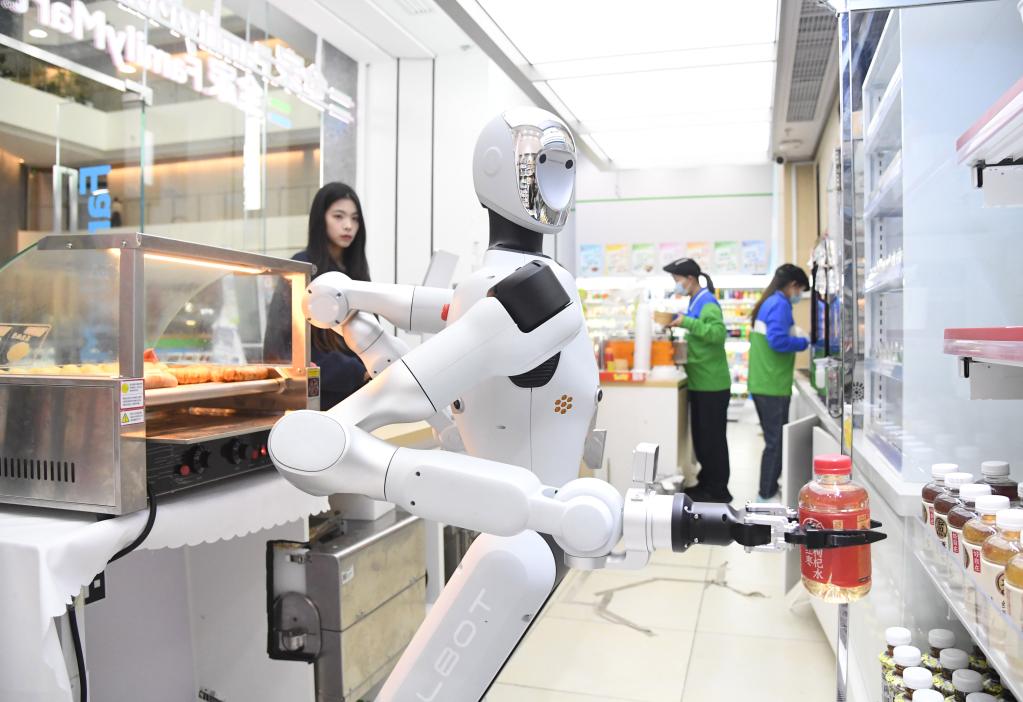 4月22日,在北京市海淀区中关村大街的一座大厦内便利店,机器人为顾客抓取饮料。新华社记者 任超 摄