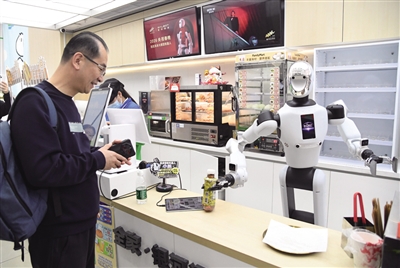 近日,在北京市海淀区中关村大街一座大厦内的便利店,机器人将抓取好的饮料交给顾客。 新华社记者 任超 摄