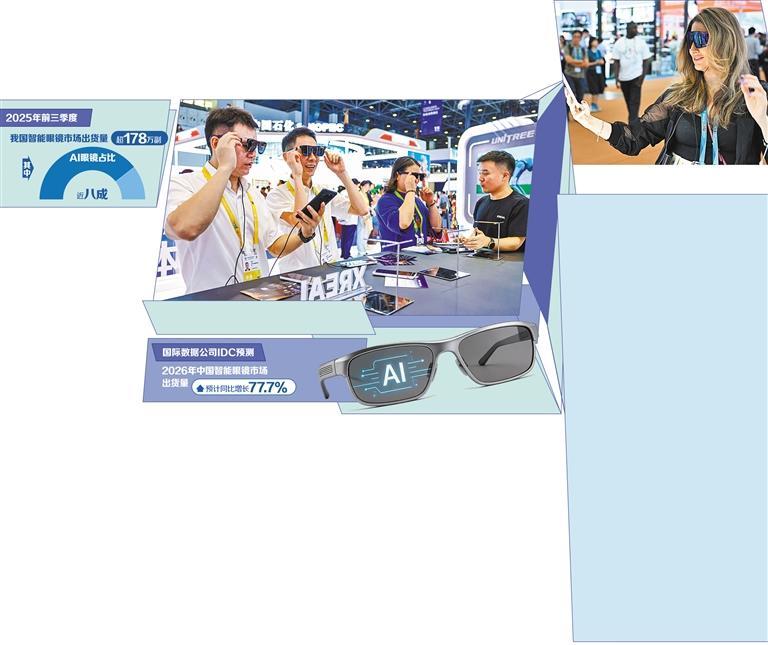 数据显示,2025年前三季度,我国智能眼镜市场出货量超178万副,其中近八成是AI眼镜。国际数据公司IDC预测,2026年中国智能眼镜市场出货量预计同比增长77.7%。